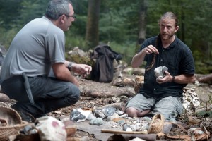 Swiss archaeologist Kim Pasche talks to his students during a "wilderness skills" training course in Rhodes, eastern France, on July 30, 2015. For three days participants are taught by Kim Pasche, 32, a Swiss archaeologist specialized in prehistory, who became a trapper in northern Canada, where he lives most of the year. AFP PHOTO / FREDERICK FLORIN