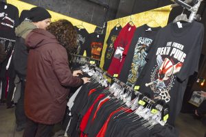 Des dizaines de tee-shirts et de produits dérivés autour du metal sont à vendre.