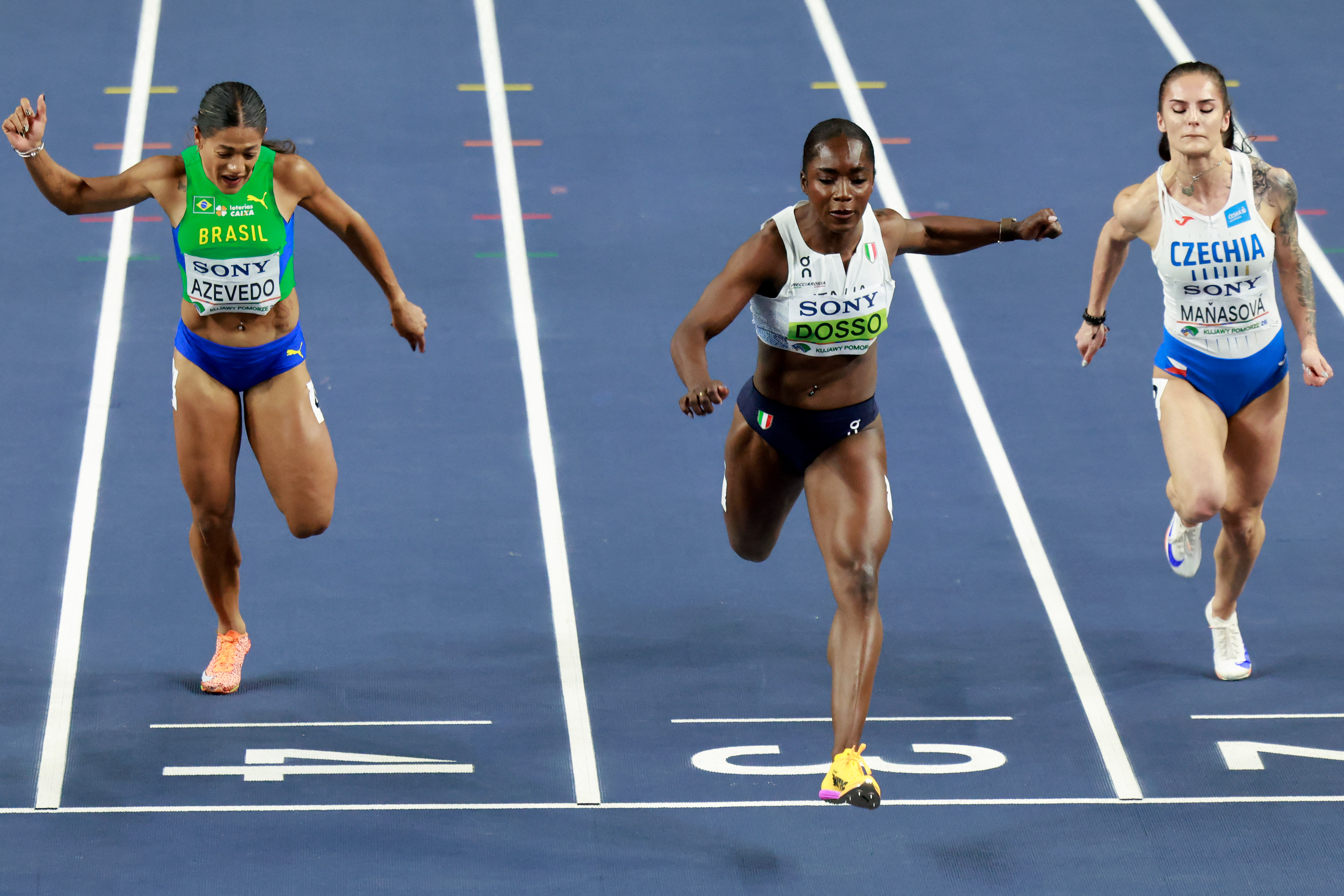 Couloir n°3, on voit Patrizia Van der Weken prendre patiemment ses marques, aidée par un mètre, afin de caler les starts à la bonne distance. Une petite mise en action sur 25-30 m, elle se frappe sur les cuisses et attend la présentation des athlètes. Quand la caméra s’arrête sur lui, elle fait un tout petit signe des deux mains et retourne vite à sa concentration.
