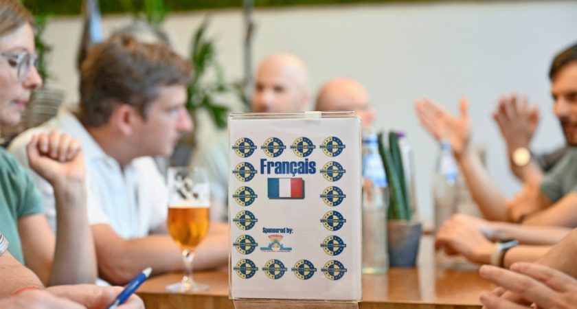 Il est à peine 19 h quand le fond de la salle du café Le Quai Steffen se met à vibrer : les chaises raclent le sol, les banquettes se creusent pour accueillir de nouveaux venus, les vestes sont accrochées à la hâte. «Moien», «Hi», «Bonjour» fusent de tous côtés, suivis de rires. En quelques minutes, un brouhaha plurilingue emplit les lieux. Rien d’inhabituel au Luxembourg, si ce ne sont les dictionnaires et les petits drapeaux posés sur les tables. C’est Volkert Behr, le président du Club polyglotte, qui les a disposés quelques minutes auparavant.