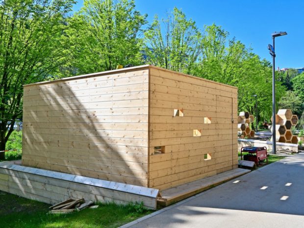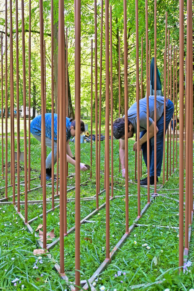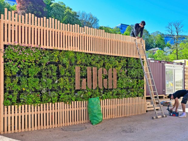 Vous pouvez alors observer sur les surfaces de la structure en bois des miroirs qui dévoilent la faune et la flore présentent dans les parois de la forteresse. Un peu plus loin, une autre installation attire les regards : «Grow Together Grow Green». Face à nous, des gradins sur lesquels sont installés des milliers d’arbustes. Le projet a pour finalité de sensibiliser le public au reboisement dans les villes. Étant reproductible, passé six mois, l’installation sera reconstruite et remontée à un autre endroit.