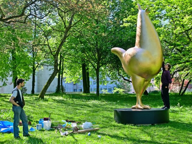 À proximité, de cet emplacement, l’Atelier Van Lieshout présente aussi un projet d’animal à plumes intitulé Le Cri. Le gallinacé est généralement de petite taille, peu impressionnant et qu’on remarque à peine. Le cri inverse toute cette description. Vous vous retrouvez ainsi devant un animal doré énorme aux proportions hors normes. Une sculpture ressemblant à un trophée, mais qui nous questionne sur l’élevage industriel.