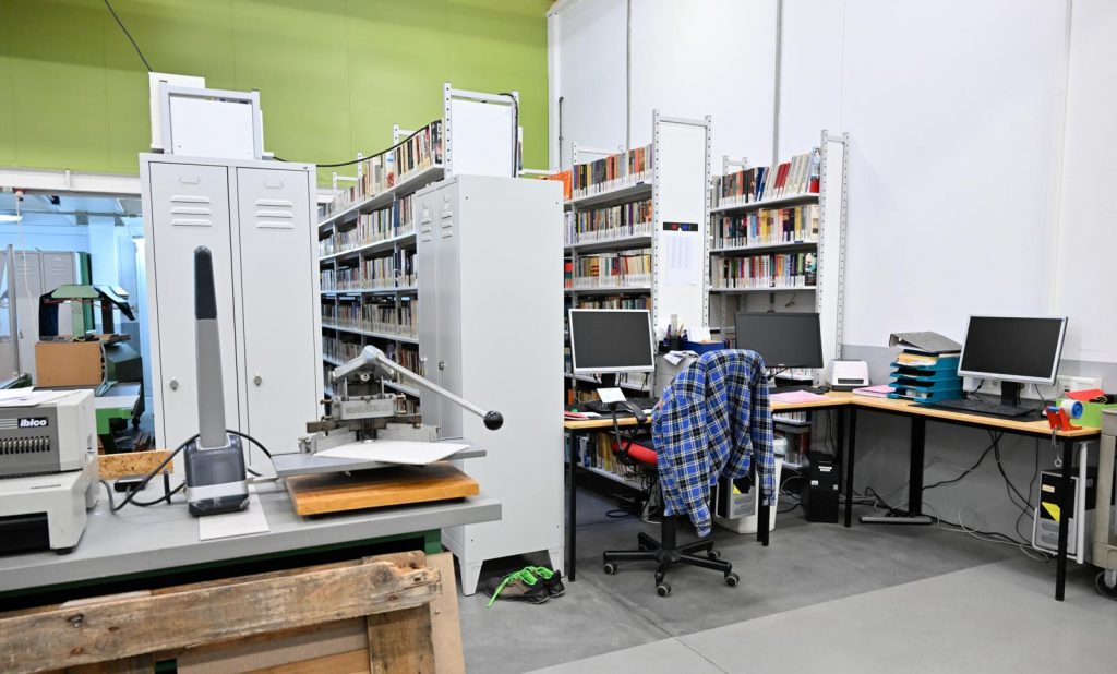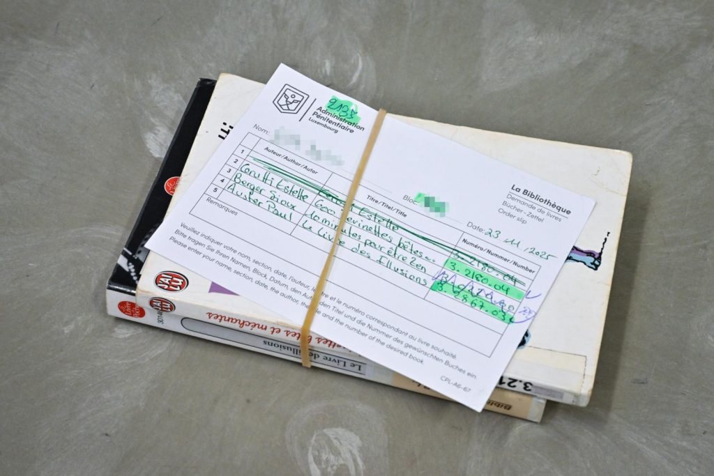 La bibliothèque occupe aujourd’hui un coin de l’atelier reliure. Quatre rayonnages métalliques blancs y sont alignés, remplis d’environ 14 000 livres rangés selon leur cote. Installé au bout des étagères, le coin bureau a un aspect purement fonctionnel. La gestion quotidienne est assurée chaque matin par un détenu, chargé de centraliser les demandes de ses compagnons.  Il travaille sous la supervision de Géraldine Thill, relieuse de métier depuis 25 ans. «La bibliothèque était déjà là en 2021 quand j’ai commencé à travailler ici», précise-t-elle. Un atelier lecture aurait bien existé «dans le temps», mais aujourd’hui les détenus lisent surtout en cellule.