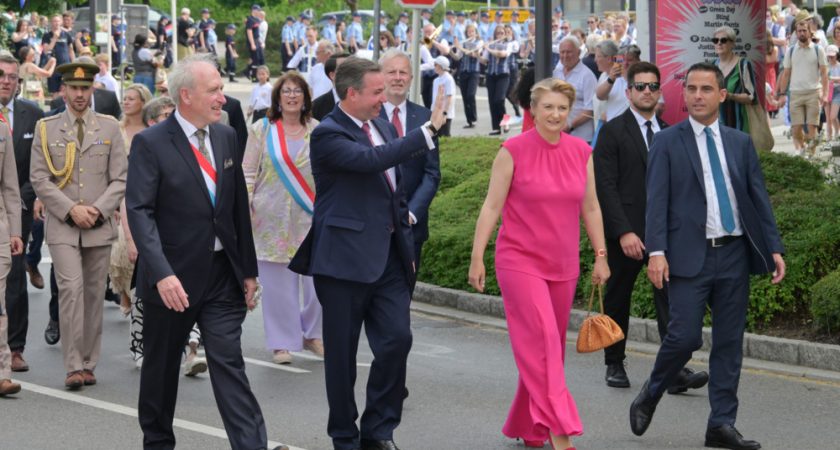 Puis, d’un coup, le silence lorsque la première moto des forces de l’ordre ouvre la voie, suivie par la voiture tant attendue. Sans plus attendre, le Grand-Duc héritier et de la Grande-Duchesse héritière sortent du véhicule et lancent les festivités. Après l’émotion de l’hymne national et du dépôt d’une gerbe au monument aux morts, place aux sourires et aux poignées de mains.