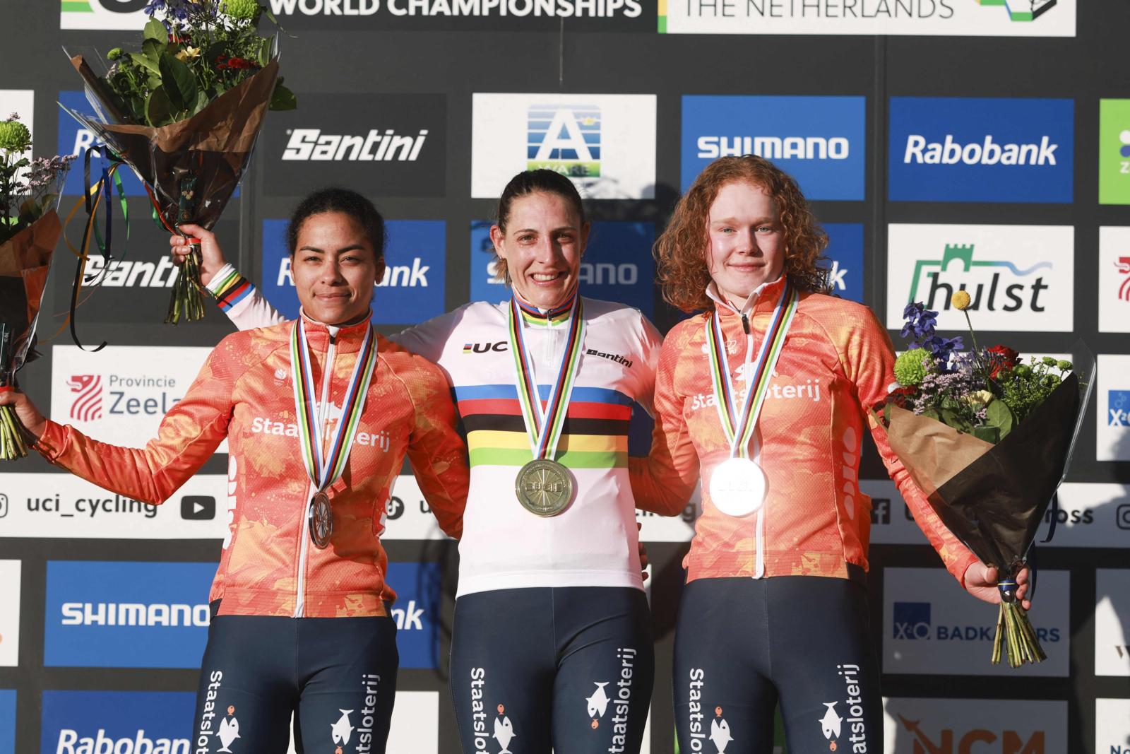 Les Mondiaux de Hulst ont offert aux organisateurs un podium 100% néerlandais avec de gauche à droite Ceylin Alvarado, Lucinda Brand et Puck Pieterse (Photo : AFP).