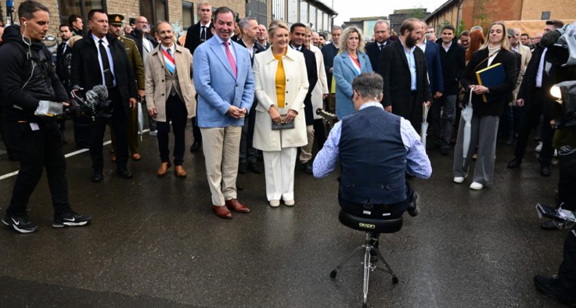 Lorsque le couple grand-ducal arrive à Dudelange à 17 h 40, les nuages ont totalement disparu du ciel. C’est sous un grand soleil que le couple entame sa visite au son de la mandoline, interprétée par David Rio Costa, pour une déambulation en compagnie de la Fondation Kräizbierg, la Fondation autisme et la Ligue HMC. Pour ce quatrième arrêt, c’est la thématique du mouvement qui a été choisie.