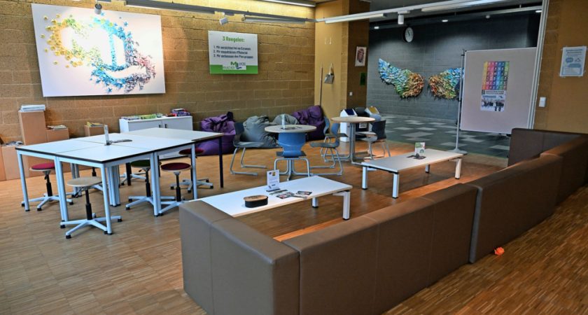 Au sol, dans certains endroits du Maacher Lycée à Grevenmacher, des lignes vertes délimitent des zones où l’utilisation du téléphone portable est proscrite. Dans ces aires dédiées à la déconnexion, les quelque 1 300 élèves qui fréquentent le lieu ont le loisir de jouer à des jeux de société, participer à des parties de babyfoot ou d’échecs ou tout simplement prendre le temps de se détendre et de bavarder entre eux installés sur de confortables canapés.
