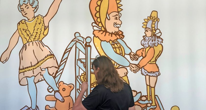 Il en va ainsi, sur ces deux derniers points, de la grande fresque qui ouvre l’exposition, inspirée du travail de l’Américaine Julie Becker (1972-2016), connue pour ses œuvres en miniature. Aline Bouvy assume la dimension opposée, avec sa galerie de personnages placardée en géant sur les murs du Casino : poupées, ballerine de boîte à bijoux, animaux en peluche et diable en boîte, c’est tout un inventaire des classiques des jouets d’enfants qu’a peint l’artiste, comme représentants d’un «monde psychologique parallèle» aux «accents macabres», choisis pour refléter cette «notion abstraite de l’enfance» inspirée par et théorisée dans le livre de l’universitaire américain Lee Edelman au titre sans équivoque : No Future.