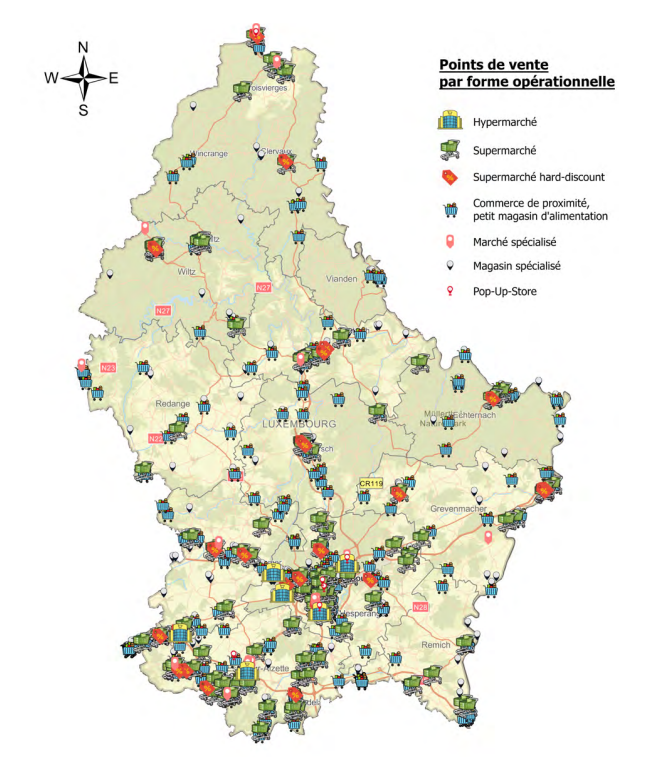 D’après cette étude, ces établissements se concentrent principalement autour de la capitale et au sud du pays. Au nord, ils se font plus rares. Il n’y a par exemple aucun hypermarché au nord de Luxembourg. Les supermarchés hard-discount, qui connaissent également une hausse de leurs points de vente, sont mieux répartis dans l’ensemble du pays. Le Luxembourg compte six hypermarchés, 109 supermarchés, 31 enseignes hard-discounts et 313 petits supermarchés. Les surfaces de vente sont respectivement de 28 090 m² (hypermarchés), 116 526 m² (supermarchés), 33 460 m² (hard-discount) et 38 339 m² (petits supermarchés).