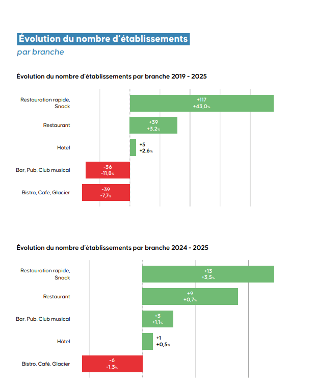 Le «Retail Report» rapporte également plusieurs données concernant le secteur de l’Horeca. Au total, la branche comprend 2 597 établissements (+3,4 % depuis 2019). Parmi eux, on compte 1 270 restaurants, 389 fast-foods, 470 bistrots, cafés et glaciers, 269 bars, pubs ou clubs musicaux et 199 hôtels. Ces lieux se situent davantage dans le sud du pays. Les fast-foods connaissent une augmentation fulgurante de leurs points de vente depuis 2019 (+43 %) (voir graphique ci-dessous).