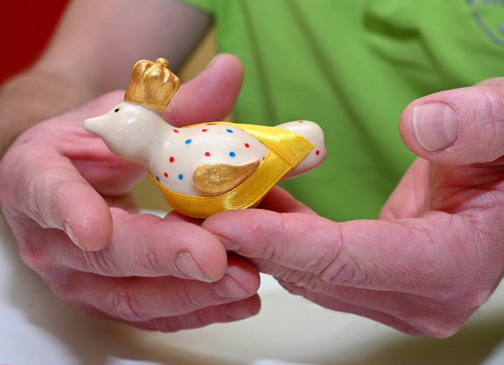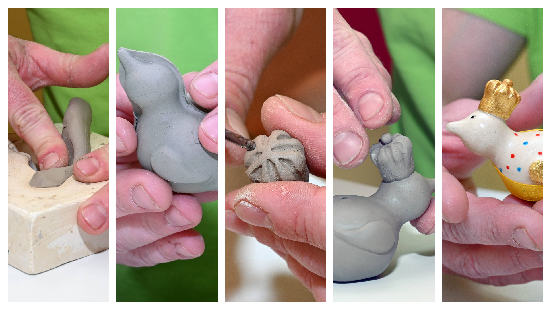 Le travail se divise en quatre étapes : la moulure du Péckvillchen déjà, grâce à l’argile. «Il faut faire attention à la forme et la taille du trou que vous formez dans le moule», détaille le potier. Un Péckvillchen est en effet un modèle unique : chaque sifflement est différent en fonction de la taille de la céramique.