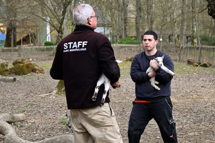 Penché sur une chèvre, William, l’un des gardiens des animaux du bois, s’applique de son côté à poser des bagues d’identification : «On pince ça sur leurs oreilles pour reconnaître les petites nouvelles qui viennent d’arriver. On a eu cinq bébés!»