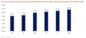 Le taux de croissance moyen de l’Union européenne est néanmoins légèrement plus élevé que celui du Luxembourg. Cela s’explique par le processus de convergence à l’œuvre dans les pays du sud (Portugal, Italie) et d’Europe de l’Est (avec en tête la Lituanie, + 10% par an en moyenne entre 1995 et 2023) qui a tiré la productivité européenne vers le haut. Malgré le rattrapage de certains pays, les travailleurs luxembourgeois ont une productivité nominale presque deux fois plus élevée que la moyenne de la zone euro, loin devant la grande majorité des autres pays. Cet avantage luxembourgeois s’est par ailleurs creusé en trente ans, notamment par rapport à l’Allemagne ou à la France.