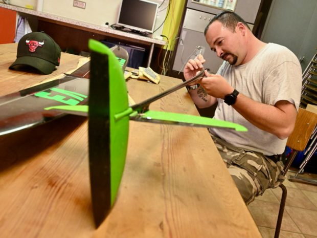 «On a plusieurs catégories. Celle des planeurs, avec les électriques, remorqués avec un treuil puis lâchés dans les airs, ceux avec un moteur intégré au fuselage, comme le mien. Si jamais il descend, je peux reprendre de la hauteur. C’est conçu pour la compétition. Et il y a les maquettes, dont certaines peuvent atteindre sept mètres d’envergure! On en a un comme ça au club.»