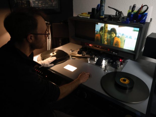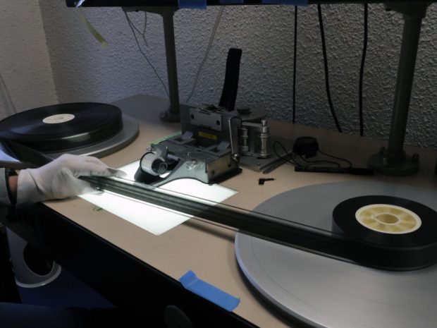 Après le passage sur la table de visionnage, le film peut, au besoin, être passé dans le nettoyeur à ultrasons pour enlever les taches d’huile. «La dernière étape avant la projection, c’est le contrôle physique à la main.» Et ça, ce sont les projectionnistes qui s’en chargent. Ce jour-là, c’est Steve qui fait dérouler les bobines entre ses mains pour vérifier si tout est en ordre. «Ici, nous contrôlons les perforations et les collures pour être sûr qu’il n’y aura pas de soucis à la projection. C’est très rare, mais ça toujours arriver.» Une fois cette étape finie, la copie est rembobinée et mise sur fin pour être prête à la projection.