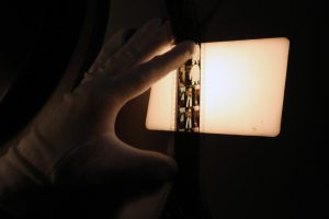 C’est là aussi qu’elles attendent d’être contrôlées. L’une des premières procédures, c’est de passer sur la table de visionnage. Georges Bildgen s’y assoit pour nous en faire une démonstration. Il y met une bobine et commence à la faire défiler. Le film L’Année du dragon défile sur l’écran. «C’est comme un projecteur», explique-t-il. La table permet de contrôler rapidement et d’approfondir l’analyse du support : qualité, état et ratio de l’image, piste sonore, producteur, marque de la pellicule et nature du support… Tout y passe. Le responsable zoome dans l’image, avance et recule le film et passe la pellicule sur le carré de lumière pour nous faire une démonstration complète. Nous mettons même notre œil au-dessus de la loupe pour inspecter les écritures présentes. Nous y lisons «Fuji Color» : «C’est une marque stable au niveau des couleurs, contrairement à Eastman par exemple qui perd rapidement et beaucoup en couleur.»