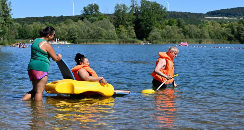 La dame qui les accompagnés jusqu’à l’eau, c’est Olivia, la responsable de la cabane de location : «On propose des pédalos, des canoés, des chaises aquatiques et on a aussi des paddles équipés de quatre places assises avec ceintures pour permettre à tous, dont les personnes à mobilité réduite, de faire le tour du lac en toute sécurité.» Pour rendre la plus belle plage du site accessible à tous, un chemin en bois amène jusqu’au sable, et un grand tapis va jusque dans l’eau.