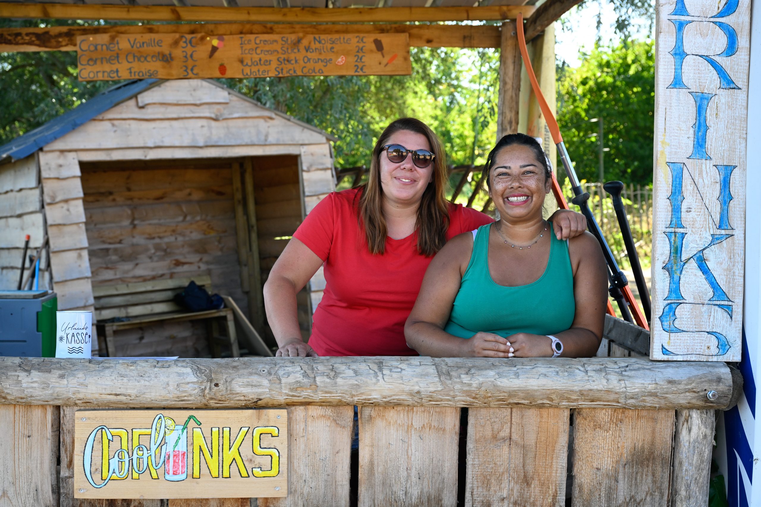 À la Schengen Plage, c’est un décor de carte postale qui attend les visiteurs, avec transats, parasols, sable fin et location de matériel nautique pour tous. Justine et son compagnon, Didier, venus de la région de Thionville, ont opté pour la chaise aquatique afin de s’offrir une baignade dans l’étang en amoureux.