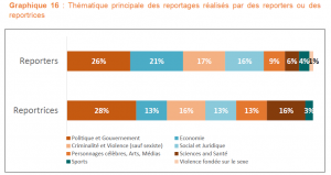 L’étude relève que les reportrices sont notamment sous-représentées dans les reportages consacrés à l’actualité internationale (22% contre 53% de reporters), souvent perçus comme plus prestigieux. Elles ont par ailleurs une place plus importante dans l’actualité locale et nationale.