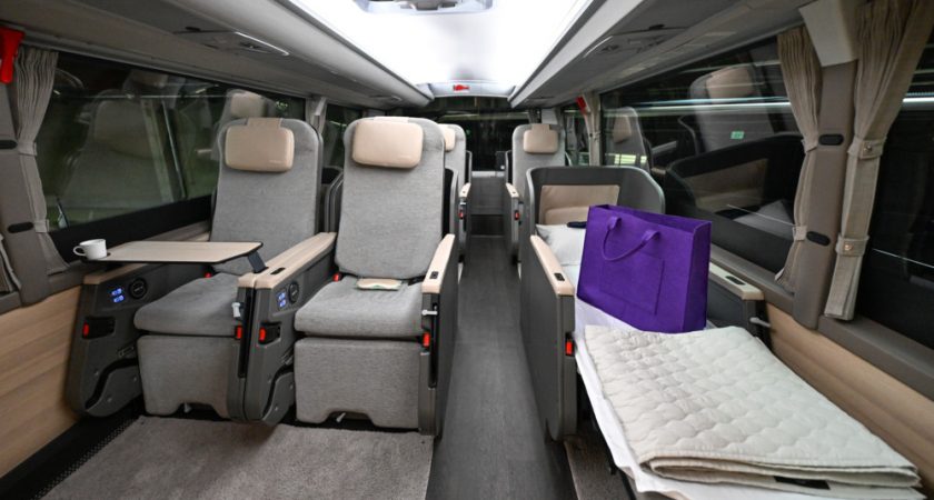 Vu de l’extérieur, rien ne le distingue d’un autre grand autocar de 15 m de long sur 4 m de haut. C’est à l’intérieur que la différence saute aux yeux. Au lieu des 80 places habituelles, ce bus n’embarque que 21 passagers, 3 au rez-de-chaussée et 18 à l’étage. Moins de voyageurs donc plus de place, des fauteuils confortables se transformant en couchette… sans oublier de grandes toilettes, un coin café et un emplacement pour une garde-robe. L’ambition est assumée : faire du car un hôtel roulant plus chic qu’un bus low cost, mais moins cher que l’avion.