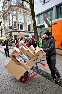 La firme de Jeff Bezos est dans le collimateur de nombreux acteurs luxembourgeois en particulier depuis qu’elle a annoncé 14 000 licenciements, dont 470 pour le seul Grand-Duché (soit 10 % des effectifs). À l’appel de la coalition Make Amazon Pay, qui organise des actions dans le monde entier chaque année pour le Black Friday, l’ASTM, le CELL, le Collectif Palestine Luxembourg, le collectif Tax Justice Lëtzebuerg, déi Lénk, etika, le département des jeunes de l’OGBL, Greenpeace Luxembourg et Rise for climate se sont donc réunis ce vendredi entre 12h30 et 14h.