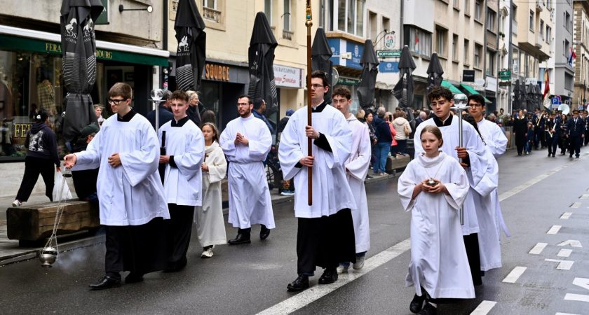 Le Grand-Duc Henri, son épouse Maria Teresa, ainsi que le Grand-Duc héritier Guillaume, accompagnée de la Grande-Duchesse héritière Stéphanie, étaient présents, d’abord lors de la messe et, ensuite, lors de la procession. L’ensemble des membres de la famille grand-ducale s’est présenté en fin d’après-midi au balcon du Palais.