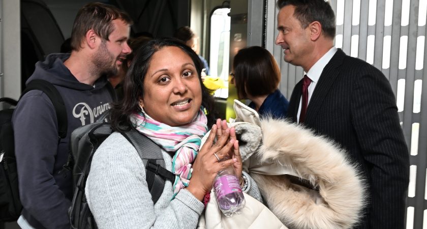 Xavier Bettel et Yurico Backes accueillent les passagers Luxair en provenance d'Oman ce vendredi matin. (Photo : hervé montaigu)