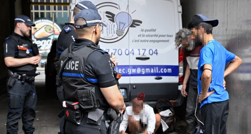 «On ne juge pas leur apparence, mais ça se voit qu’ils consomment», indique Olivier concernant les trois toxicomanes aux visages marqués. Lors de l’intervention, chacun connaît son rôle et le ton est cordial. Un policier prend les identités, tandis qu’un autre les surveille en train de ranger leurs affaires. Il reste au sol les traces de leur consommation d’héroïne, avec les flacons d’acide pour la diluer, le briquet pour la chauffer et l’aluminium pour l’inhaler.
