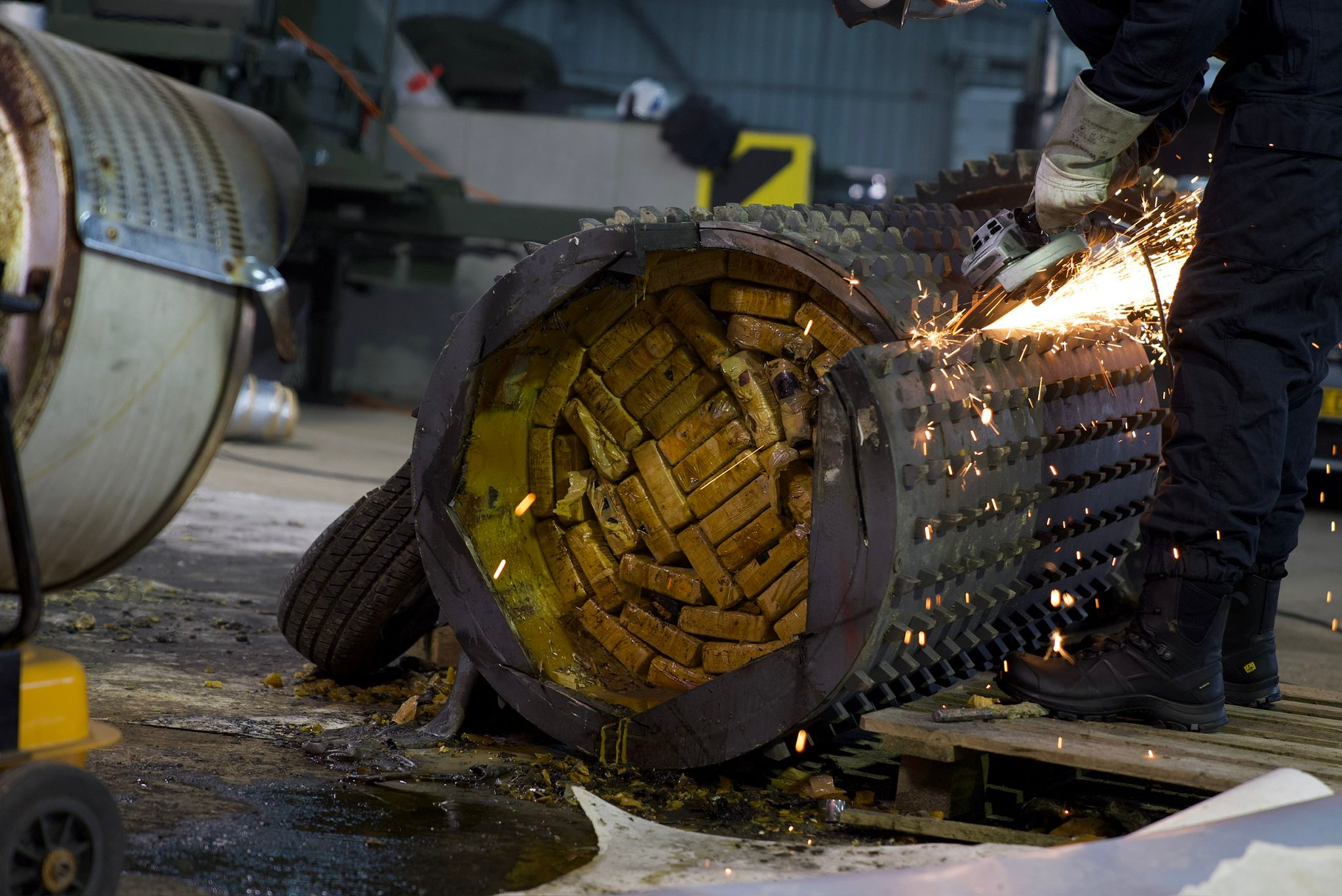 Le produit stupéfiant était caché dans les rouleaux en acier de l’engin. À coups de disqueuse, la police a pu ouvrir la cache et mettre au jour des pains de drogue soigneusement emballés. Deux personnes sont placées en détention provisoire au Luxembourg dans cette affaire.