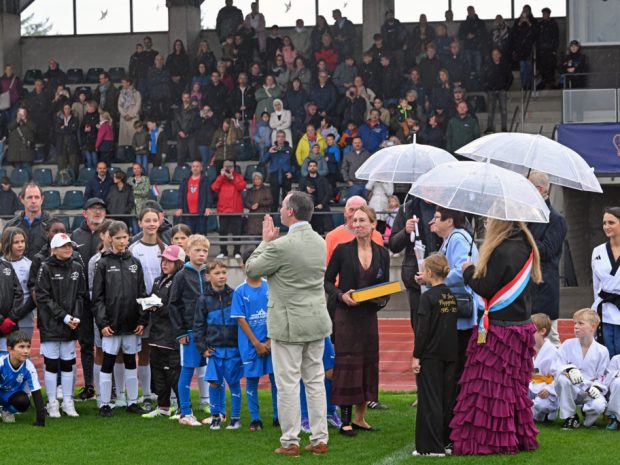 Visiblement heureux d’être présent dans l’enceinte du stade Op Flohr malgré la pluie, le Grand-Duc Guillaume prend le temps pendant une quarantaine de minutes de faire le tour des clubs présents ce 4 octobre. Cinq minutes par cinq minutes, il observe les ateliers sportifs réalisés par les jeunes athlètes. Les bénévoles, les enfants, les encadrants ont droit à un sourire, des applaudissements ou des échanges de quelques mots. Le souverain s’offre même un petit bain de foule auprès du public présent le long du terrain, derrière les barrières.