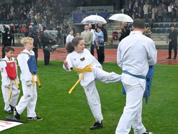 Les tribunes sont bondées, le public trépigne en regardant l’heure tourner et les nombreux parents présents dans les gradins observent fébrilement leurs enfants taper dans un ballon ou lancer des coups de pied en tenue de taekwondo. Du côté de la bourgmestre de Grevenmacher, Monique Hermes (CSV), la pression monte doucement, notamment à cause de la météo. «Je suis une femme posée, mais aujourd’hui j’étais inquiète en raison de la pluie. J’ai été contactée par la Cour qui m’a donné la responsabilité de la décision de maintenir ou non l’évènement. J’ai décidé de dire oui !»