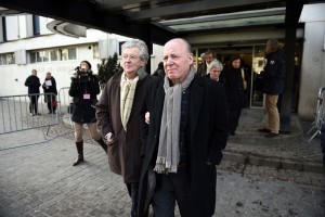 Carlton Public Relations officer Rene Kojfer (R) and his lawyer Hubert Delarue leave the court in Lille, northern France, on February 3, 2015, on the second day of the so-called « Carlton Case » trial. The sexual proclivities of ex-IMF chief Dominique Strauss-Kahn come under the spotlight again on February 2 when he goes on trial in Lille for « pimping » four years after a sex scandal cost him a shot at the presidency. The disgraced 65-year-old economist finds himself back in the dock, accused of being part of a prostitution ring used by his entourage to organise sex parties for him in Brussels, Paris and Washington. AFP PHOTO / MARTIN BUREAU