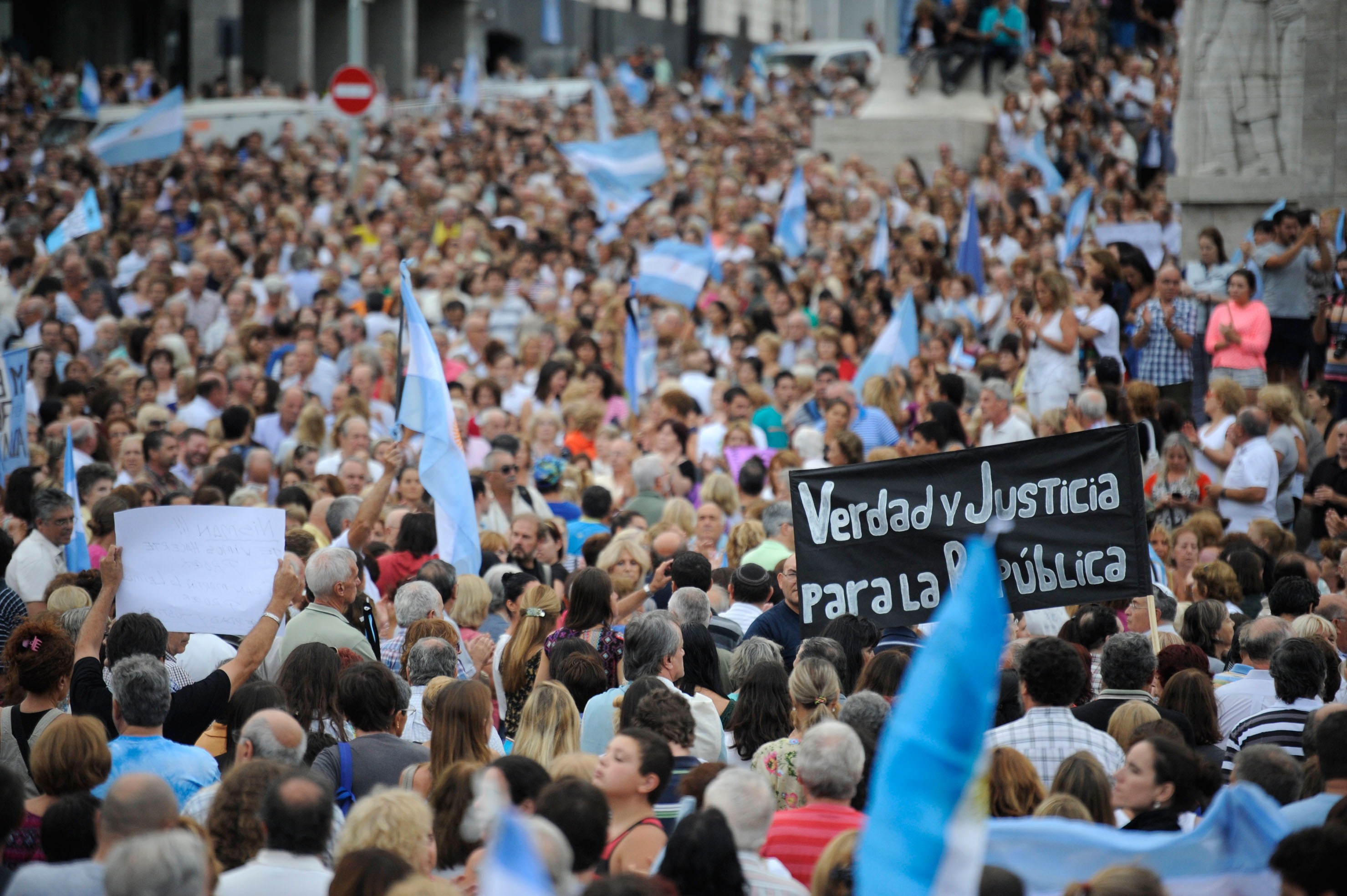 People gather in Rosario, Argentina on February 18, 2015, during a march simultaneous to the « Marcha del silencio » (March of Silence) called by Argentine prosecutors in memory of their late colleague Alberto Nisman in Buenos Aires. President Cristina Kirchner urged Argentines to be on guard Wednesday ahead of a mass protest over the mysterious death of Nisman who had accused her of a cover-up in his probe of a 1994 bombing. Nisman was found in his Buenos Aires apartment with a bullet through his head on January 18, the day before he was to go before a congressional hearing to air his finding that Kirchner and her foreign minister plotted to shield Iranian officials implicated in the bombing of the AMIA Jewish-Argentine charity. The sign reads « Truth and Justice for the Republic ». AFP PHOTO / NA – Agencia Cordoba