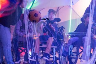 À l’abri dans «l’Igloo», Mervé, Milan et Titouan lancent, chacun leur tour, depuis leurs fauteuils roulants, un ballon en mousse qui, lorsqu’il vient percuter le filet équipé d’un capteur électronique, déclenche un air de Vivaldi ...