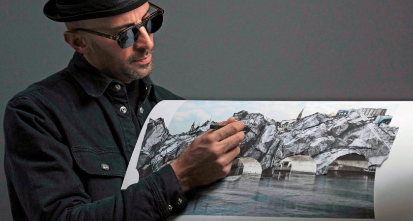 Sur une grande table en bois côtoyant le sapin de Noël de l’atelier parisien de JR s’empilent des découpages et collages en noir et blanc, couleurs de prédilection de ses œuvres. Dans son atelier, l’artiste les crayonne au fusain, sans se déparer de ses emblématiques lunettes et chapeau noirs. Les montages photographiques montrent le célèbre pont, situé au cœur de la capitale, recouvert de roche aux arêtes acérées. Seule la forme de ses arches permet de reconnaître le Pont-Neuf.