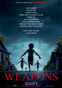 Si Weapons pouvait se disputer le titre de meilleur film d’horreur de l’année (voir Together), c’est parce qu’il vise bien au-delà de la niche des fans du genre. Déjà par son intrigant postulat de départ : dans une petite ville de l’est des États-Unis, 17 enfants sortent de chez eux en pleine nuit et disparaissent à la même heure. Ensuite, pour sa façon de tenir le mystère, découpant le récit en six points de vue différents (l’institutrice, le père d’un disparu, l’enfant survivant…). Et, en bout de course, une fable horrifique originale, palpitante et jubilatoire, dont la structure en chapitres, comme autant de trajectoires psychologiques ancrées dans le réel, traduit aussi l’individualisation et les angoisses du monde d’aujourd’hui.