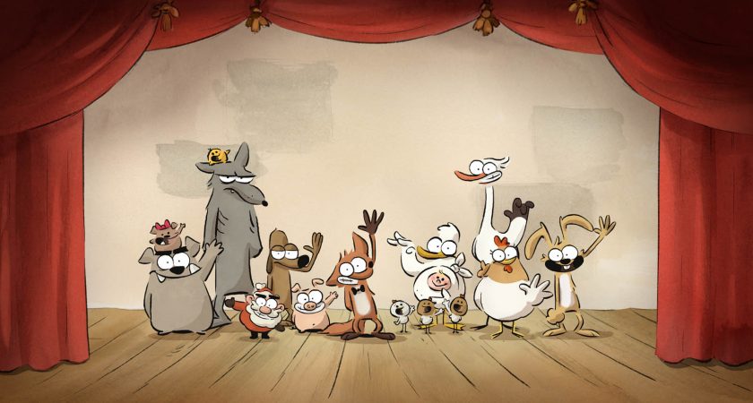 C’est ainsi qu’avec d’un côté l’histoire originelle et de l’autre la structure initiale du projet BD, ce Le Grand Méchant Renard et autres contes est présenté tel une pièce de théâtre en trois actes – de 26 minutes chacun, autrement dit la durée prévue pour le projet télé – et quelques interludes gagesques. Chaque acte présente donc un récit différent, mais avec les mêmes personnages. Des animaux pour le moins surprenants, qu’on pourrait aisément imaginer dans un hôpital psychiatrique, entre un renard faible, trouillard et sentimental, incapable d’assumer son statut de prédateur et une basse-cour survoltée avec un cochon qui se prend pour un jardinier, une poule caractérielle, un lapin idiot, une cigogne éméchée, un chien de garde tire-au-flanc ou encore un canard qui veut remplacer le père Noël…