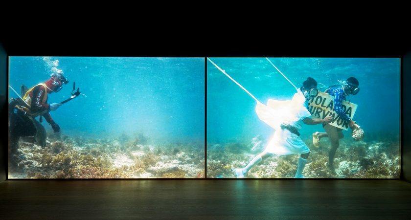 Marie-Noëlle Farcy l’extériorise, «C’est très inquiétant : il y a un côté électrique, carcéral !» Une dernière salle, et deux écrans s’imposent comme une bouffée d’air frais. L’Américaine Jennifer Allora et le Cubain Guillermo Calzadilla réalisent Returning Sound et Half Mast / Full Mast. Pour cadre, l’île de Vieques voisine de Porto Rico, longtemps utilisée comme base militaire par l’armée américaine. Les deux œuvres résonnent comme une réappropriation du territoire, un exorcisme du fantôme militaire.