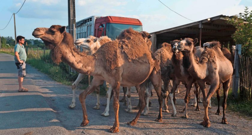 Des vaches paissent dans le vert bocage de Feignies, non loin de la zone de production du maroilles, l’emblématique fromage des Hauts-de-France. Mais dans le pré voisin, des dromadaires, chameaux et chameaux de Bactriane déploient leurs grandes silhouettes dégingandées. Ce troupeau de 80 têtes est de loin le plus important de France et l’un des plus grands d’Europe. Éleveur atypique de 43 ans, Julien Job travaillait comme transporteur d’animaux pour des zoos et des cirques avant de lancer sa «Camelerie» en 2015.