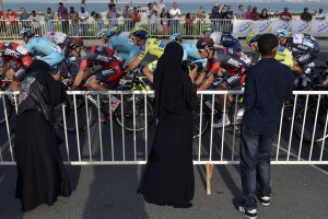 The pack rides during the sixth and last stage of the 2015 Tour of Qatar, between Sealine beach resort and Doha corniche (113,5 kms) on February 13, 2015. Dutch rider Niki Terpstra of the Etixx team retained the leader’s gold jersey of the Tour of Qatar after today’s last stage won by Irish Sam Bennett as Peter Sagan won the pearl white jersey of best young rider and Norway’s Alexander Kristoff keeps the silver jersey of general points classification best rider. AFP PHOTO / LIONEL BONAVENTURE