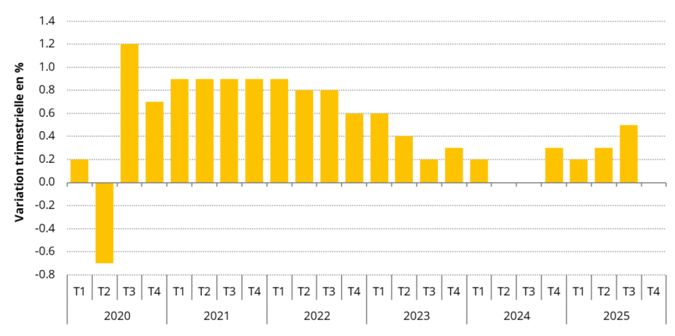 À l’inverse, la construction et l’industrie reculent au troisième trimestre. Sur un an, la construction affiche une baisse marquée de -2,1 %, principalement dans la construction de bâtiments résidentiels et non résidentiels, qui concentre les pertes d’emplois les plus importantes.