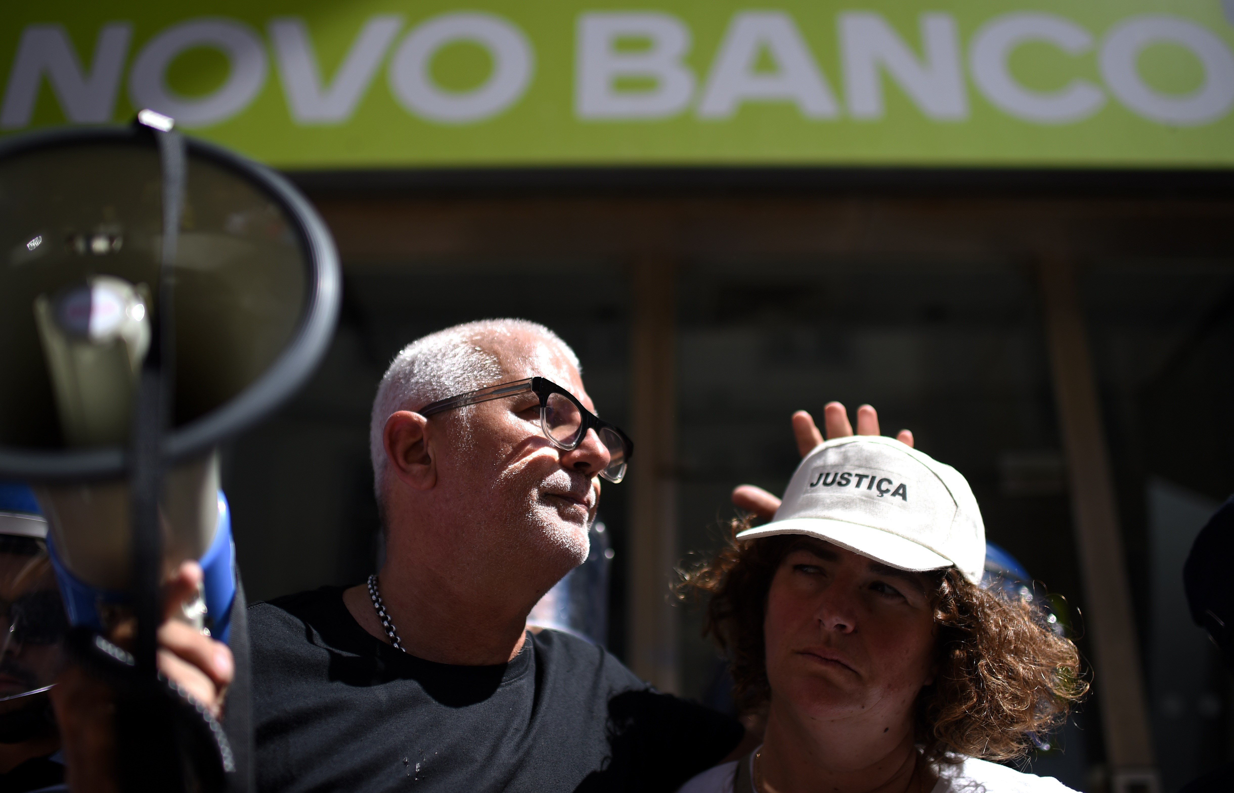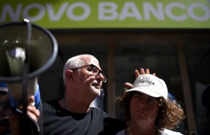 Des manifestants soutiennent les victimes d'investissements toxiques effectués par l'ancien Banco Espirito Santo (BES), désormais Novo Banco, devant le siège de la banque à Lisbonne, le 9 septembre. (photo AFP)