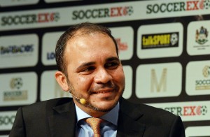(FILES) This file photo taken on September 8, 2014 shows FIFA vice-president Prince Ali Bin al-Hussein speaking during the Soccerex Global Convention 2014 in Manchester, in northwest England. FIFA vice-president Prince Ali bin Al Hussein of Jordan said on January 6, 2015 he would stand against incumbent Sepp Blatter for the presidency of world football’s governing body later this year. AFP PHOTO / FILES / PAUL ELLIS