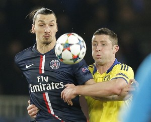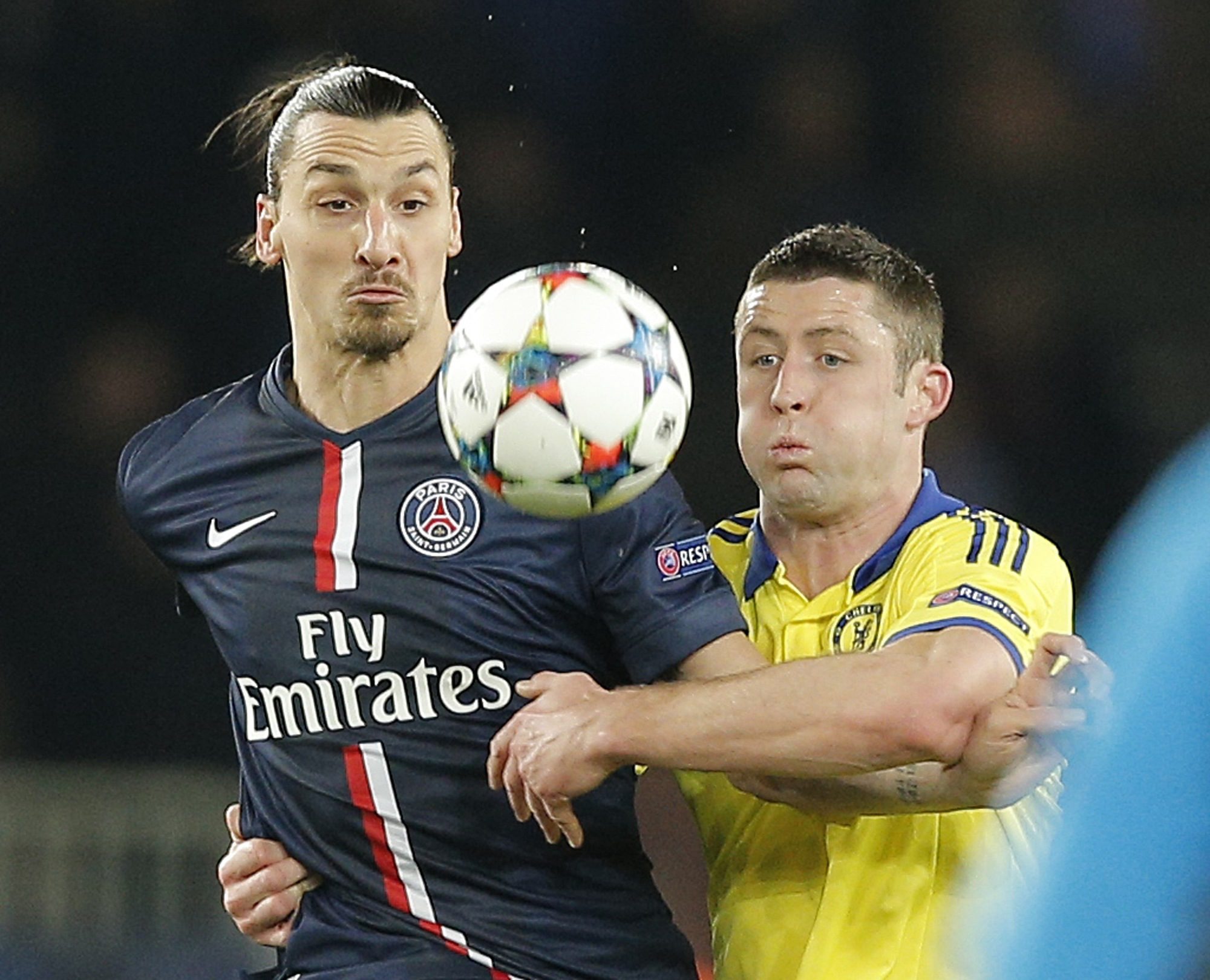 PSG’s Zlatan Ibrahimovic, left, is challenged by Chelsea’s Gary Cahill during the Champions League round of 16 first leg soccer match between Paris Saint Germain and Chelsea at the Parc des Princes stadium in Paris, France, Tuesday, Feb. 17, 2015. (AP Photo/Christophe Ena)