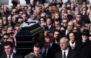 Family members and mourners follow the coffin of late Greek singer Demis Roussos during his funeral at the First Cemetery in Athens on January 30, 2015. Greek singer Demis Roussos, best known for his hit operatic pop ballads in the 1970s and 1980s, died in Athens on January 25, 2015 aged 68. AFP PHOTO / LOUISA GOULIAMAKI