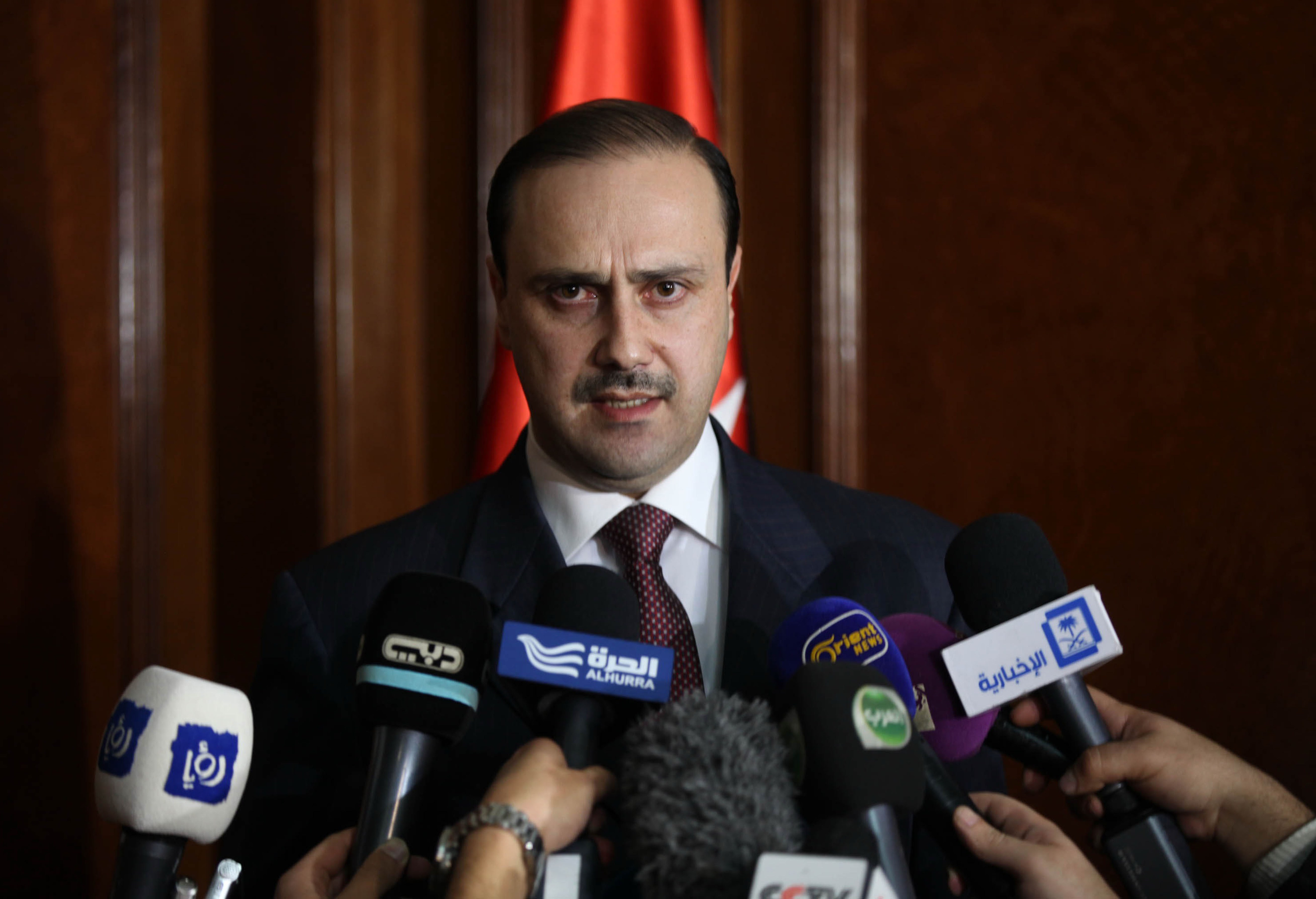 Jordan’s government spokesman Mohammed al-Momani speaks to the media after a parliamentary government closed door meeting at the House of Representatives in Amman January 29, 2015. Jordan demanded proof that a pilot threatened with execution by the Islamic State (IS) group was alive, as a deadline set by the jihadists to free a female militant expired. AFP PHOTO / KHALIL MAZRAAWI