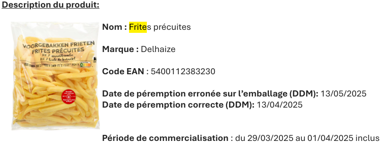 Delhaize demande à ses clients de ne pas consommer ses frites après le 13/04/2025 et de le ramener au point de vente dans lequel il a été acheté, où il sera remboursé.