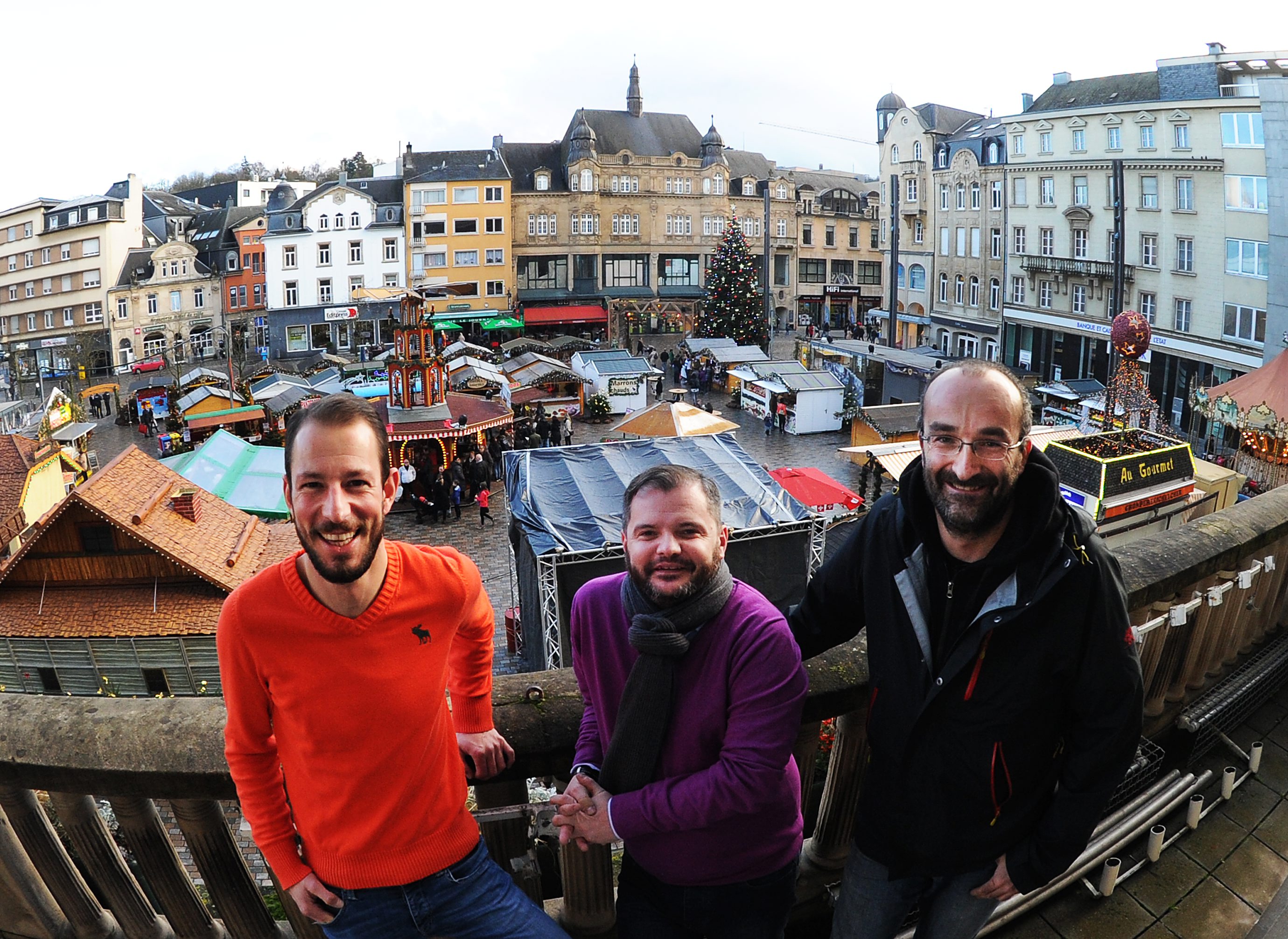 Vue plongeante sur le marché de Noël avec l'échevin eschois Daniel Codello, entouré par Luc Schloesser (Ville) et Franz Schintgen (syndicat d'initiative). (photo Isabella Finzi)