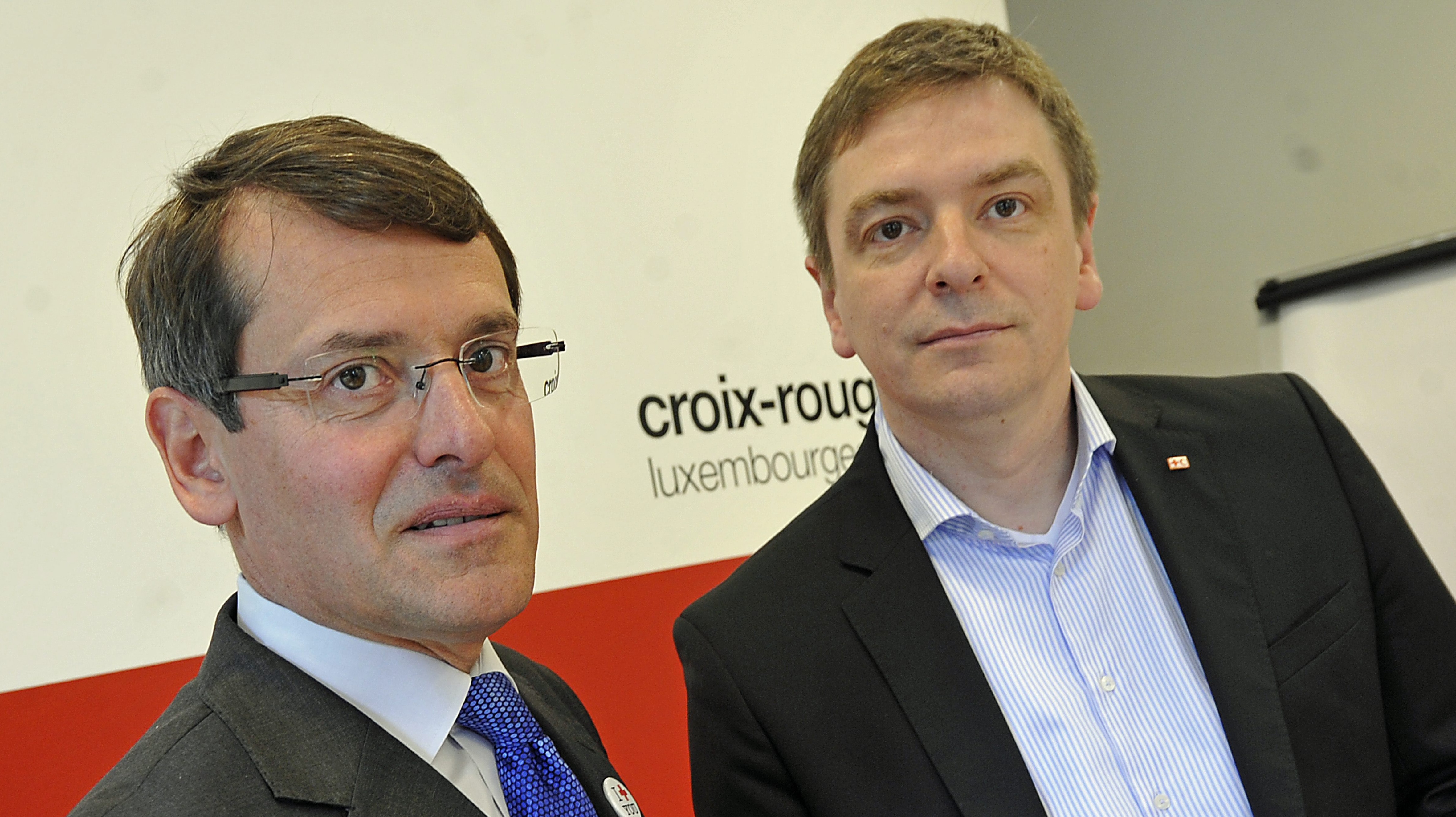 Le directeur général de la Croix-Rouge luxembourgeoise, Michel Simonis (à g.) et son adjoint, Marc Crochet, ont présenté leur rapport d'activités 2014 et rendu hommage à leurs nombreux bénévoles. (Photo : Alain Rischard)
