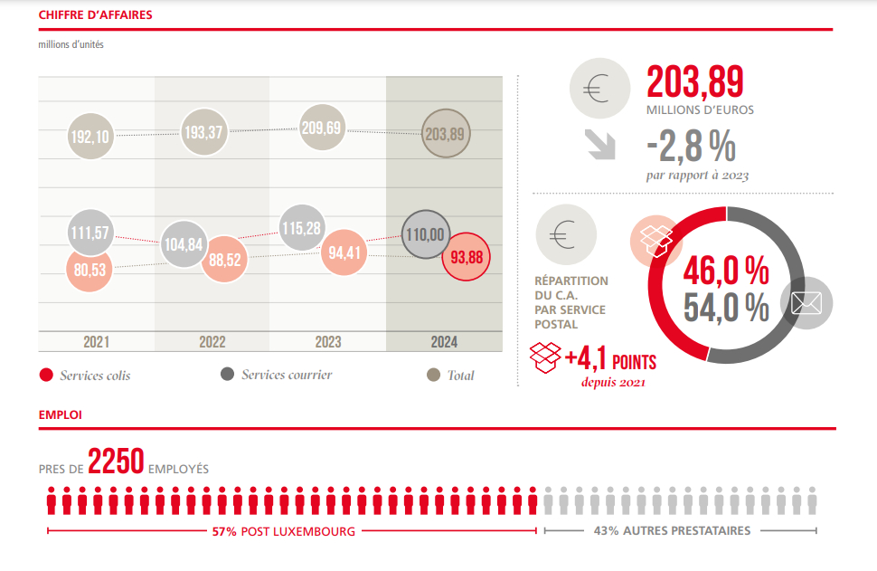 L’ILR détaille aussi l’emploi généré par le secteur postal : près de 2 250 personnes travaillaient dans ce secteur en 2024. Post Luxembourg, emploie près de 1 300 personnes, soit 57 % des emplois du secteur. Concernant l’accès aux services postaux, le groupe disposait de 97 points de vente à la fin 2024, tandis que 11 autres prestataires en détenaient 92 autres.
